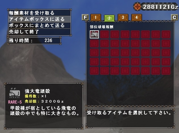 久々にぼっちPTでの討伐に成功、件の角もしっかり破壊。